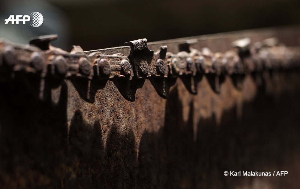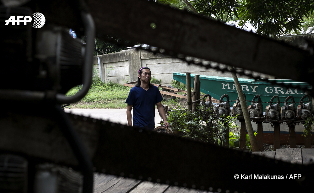 In the small front yard of the group's headquarters in Puerto Princesa, the capital of Palawan, a Christmas tree made up of more than 100 chainsaws stands two storeys high.