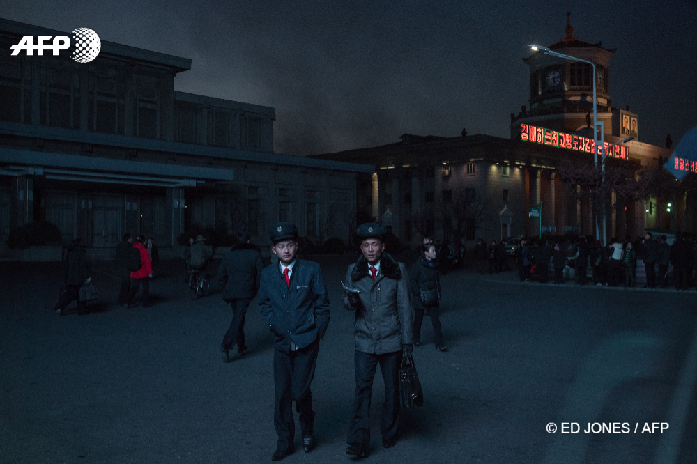 16/11/2017 - Pyongyang, North Korea - In a photo taken through the window of a car, North Korean students illuminated by a public television screen walk past the central station in Pyongyang on November 16, 2017. © ED JONES / AFP