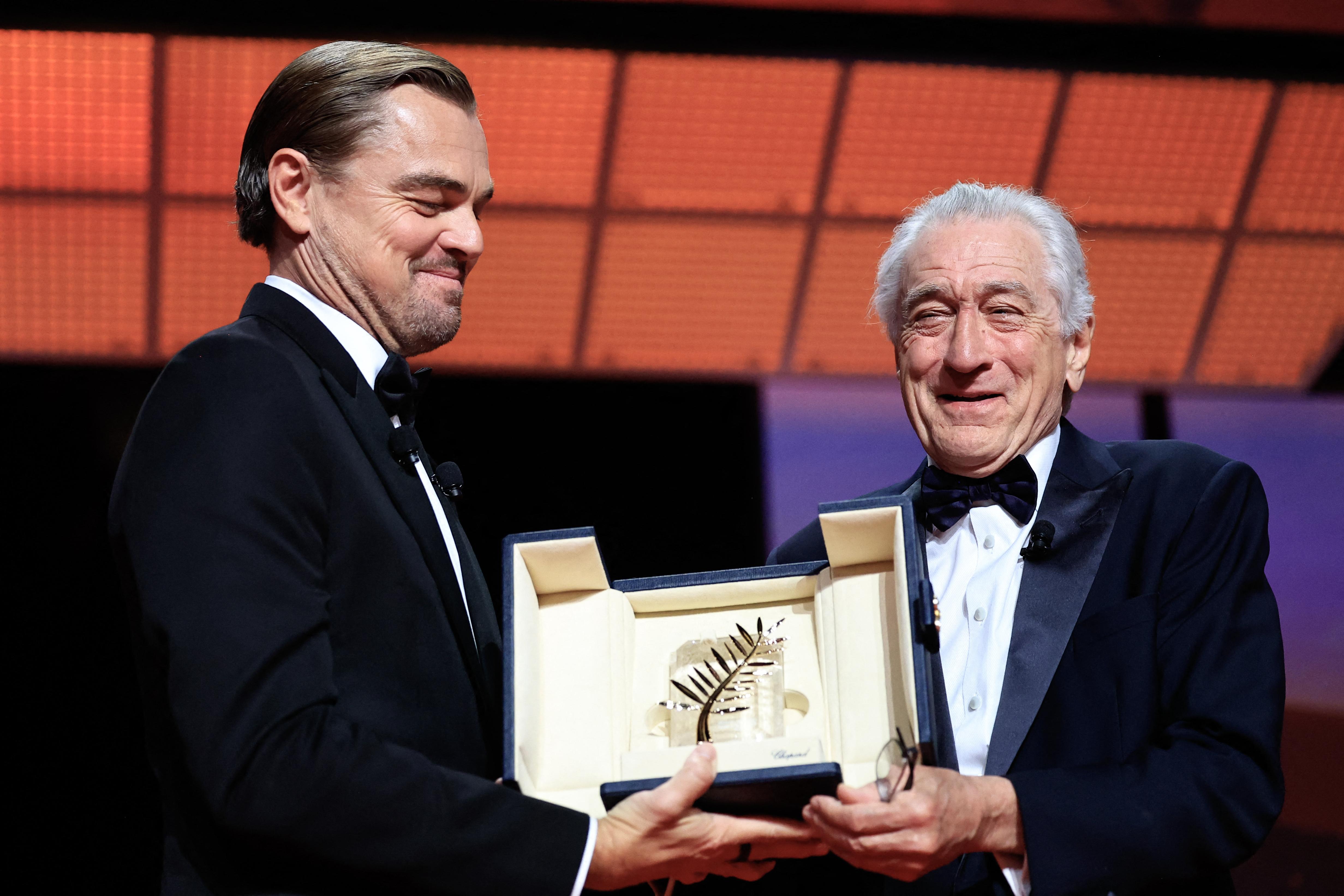 L’acteur américain Robert De Niro reçoit la Palme d’or d’honneur des mains de l’acteur américain Leonardo DiCaprio lors de la cérémonie d’ouverture, le 13 mai 2025. © Valery Hache / AFP