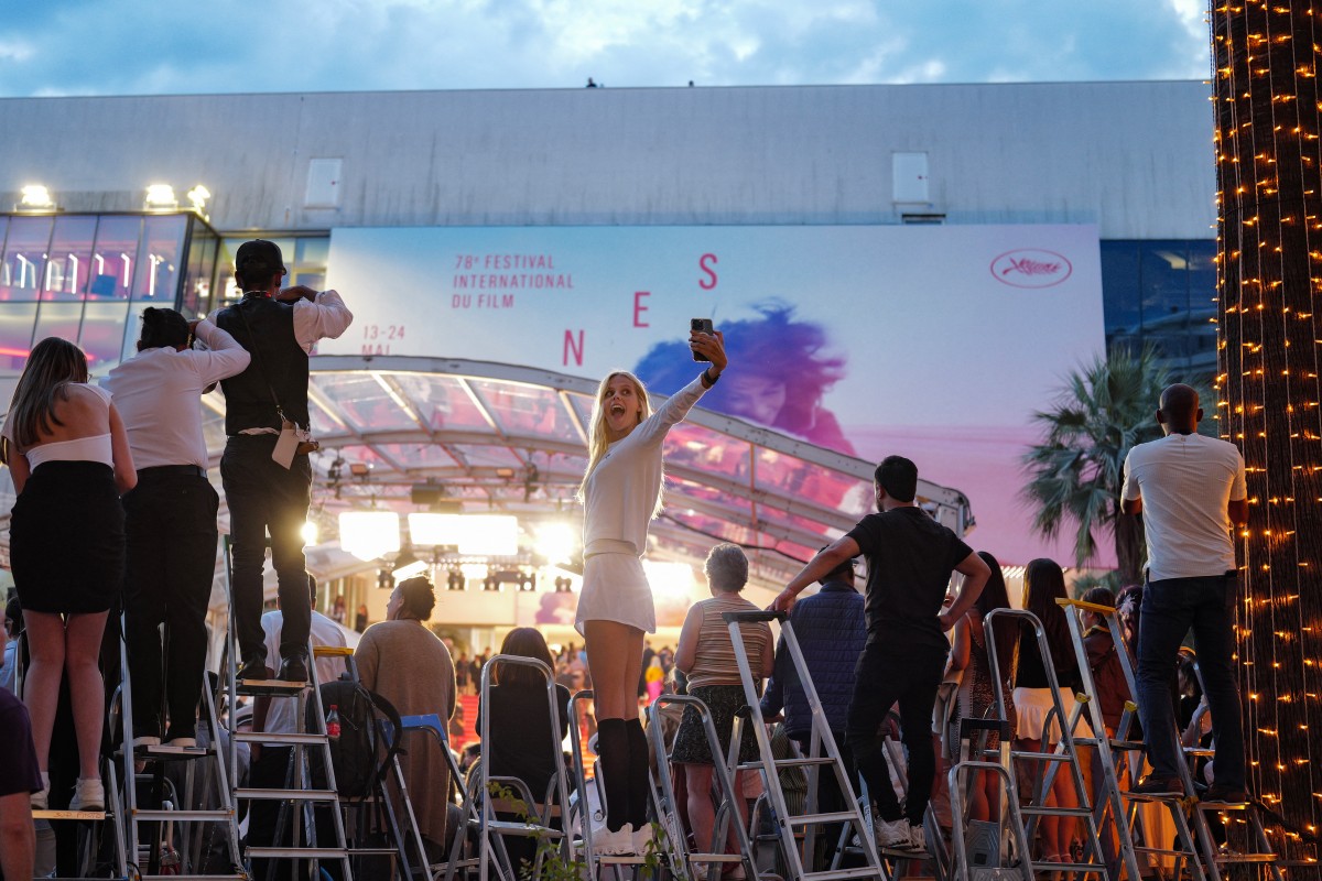 Une spectatrice prend un selfie du haut d’un escabeau en face du tapis rouge, lors de l’arrivée des invités pour la projection du film « Sirat », devant le Palais des Festivals, le 15 mai 2025. © Valery Hache / AFP