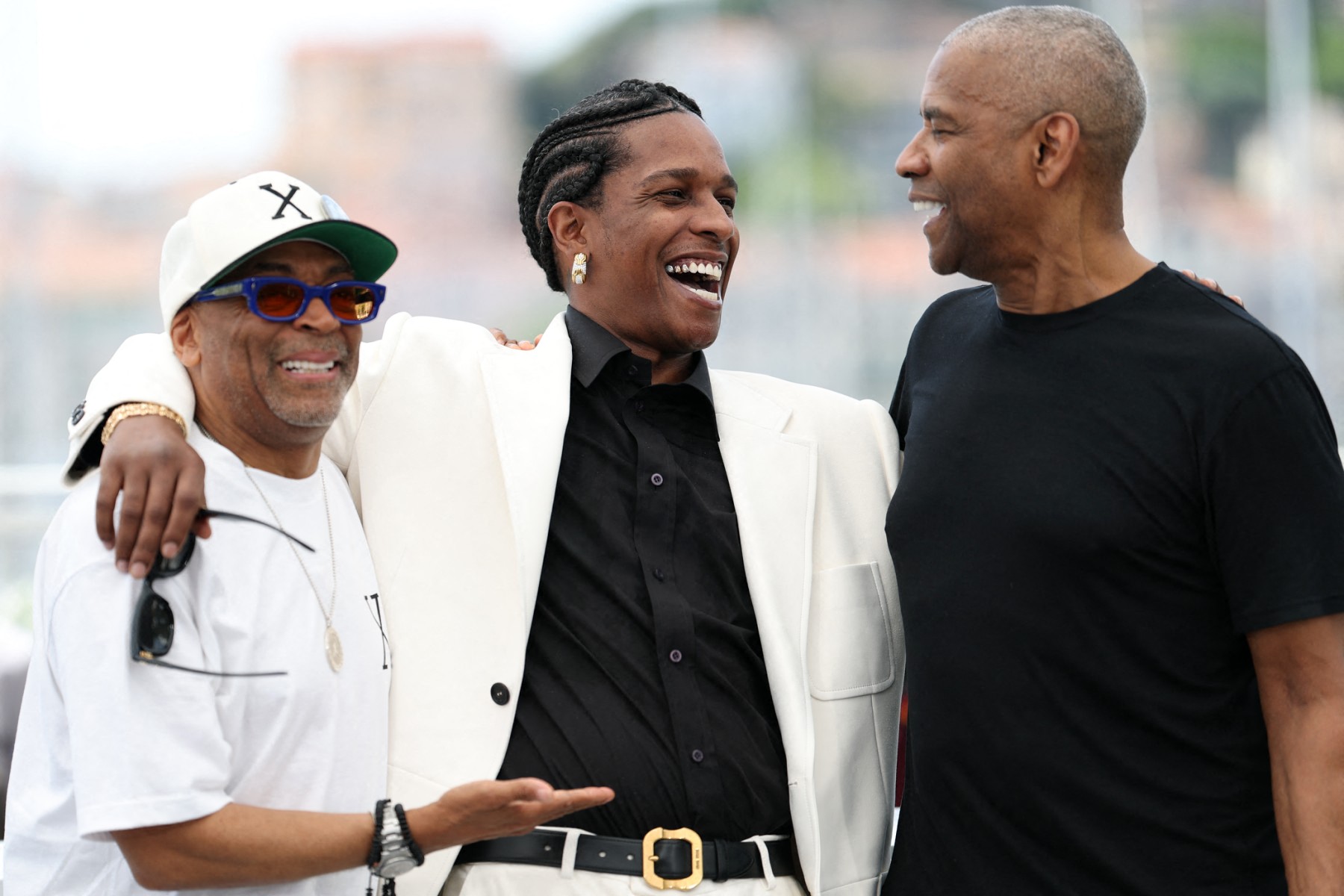 • 3e photo : Le réalisateur et producteur exécutif américain Spike Lee, l’acteur et chanteur américain ASAP Rocky, ainsi que l’acteur américain Denzel Washington posent lors d’un photocall pour le film « Highest 2 Lowest », le 19 mai 2025. © Sameer Al-Doumy / AFP
