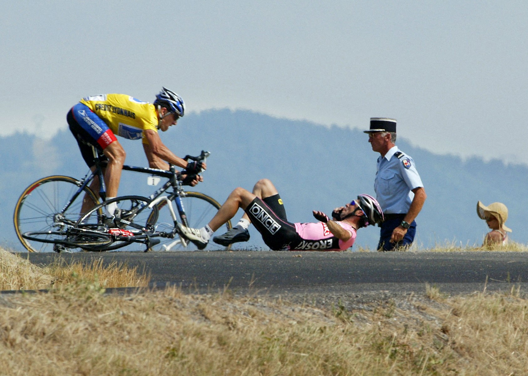 Le maillot jaune américain Lance Armstrong (US Postal/USA) évite l'Espagnol Joseba Beloki (ONCE/Esp) tombé à la fin de la neuvième étape du 90e Tour de France, le 14 juillet 2003. © Joël Saget / AFP