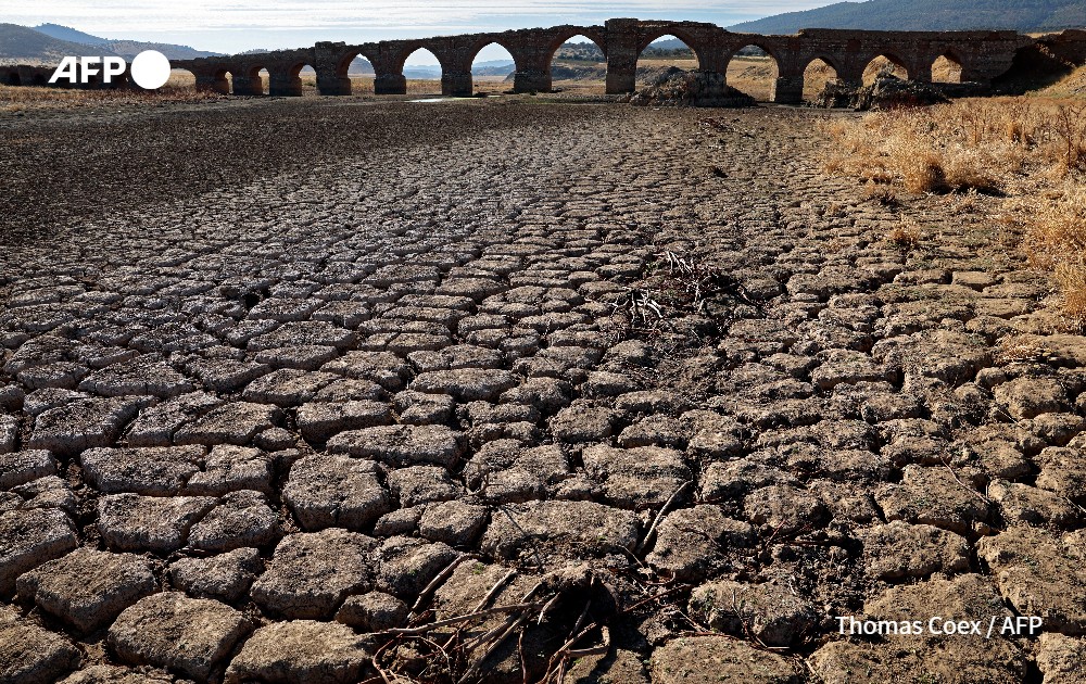 Part of the Guadiana river has dried up and gives way to dry land under the Puente de la Mesta medieval bridge in Villarta de los Montes, in the central-western Spanish region of Extremadura, on August 16, 2022. Temperatures in Spain have been very high this summer with several unusual heat waves. Scientists say human-induced climate change is making extreme weather events including heatwaves and droughts more frequent and more intense.