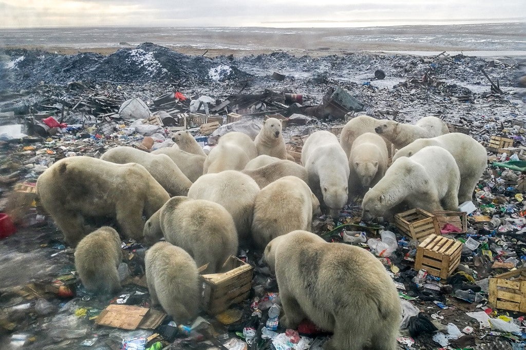 Ursos polares se alimentam em um depósito de lixo perto da aldeia de Belushya Guba, no remoto arquipélago de Novaya Zemlya, ao norte da Rússia. Alexander GRIR/AFP
