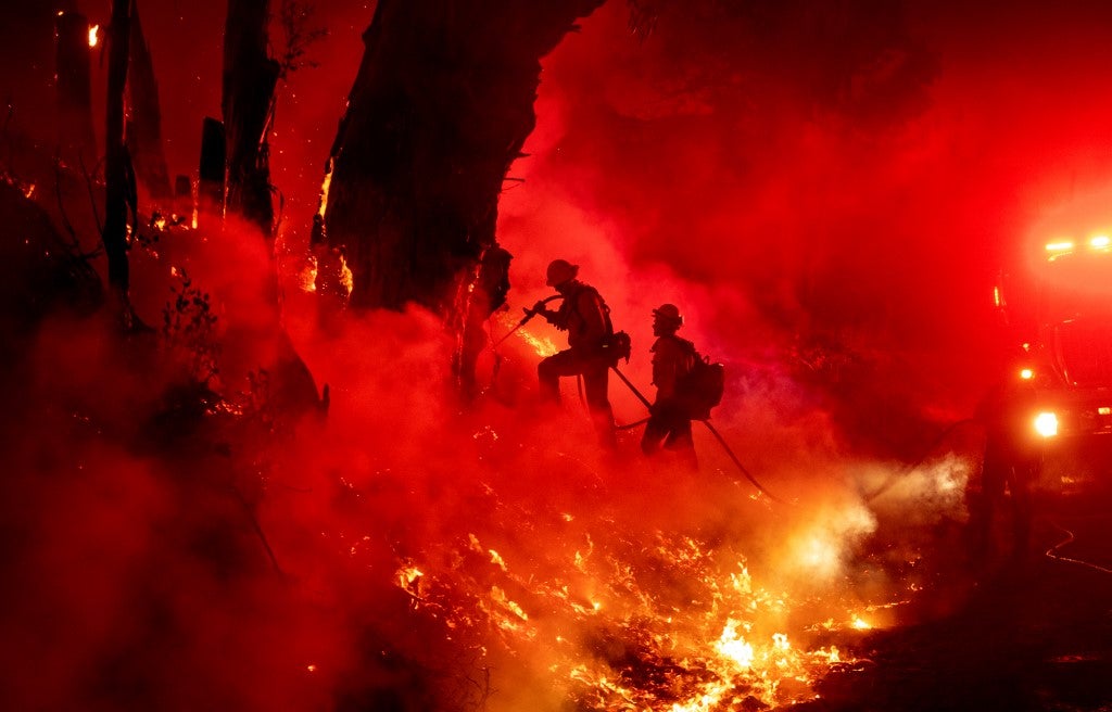 Bombeiros trabalham para controlar as chamas durante o incêndio Maria em Santa Paula, Califórnia, em 1º de novembro de 2019. Josh Edelson / AFP