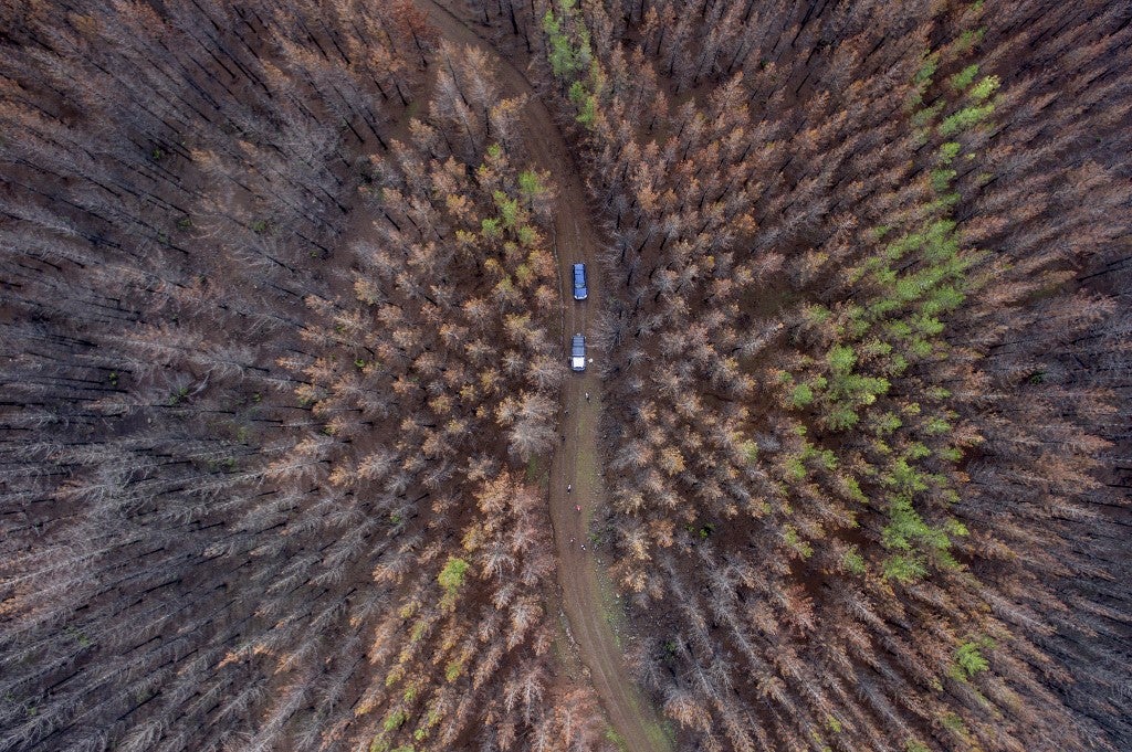Vista aérea de uma área florestal destruída por um incêndio de grandes proporções cerca de 350 quilômetros ao sul de Santiago, em 23 de junho de 2017. Martin BERNETTI / AFP